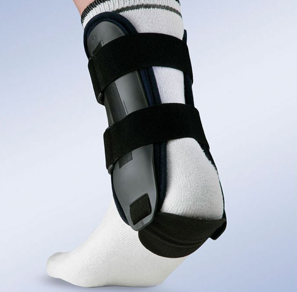 -Orthèse bivalve de la cheville, en thermoplastique rigide, pourvue d’un coussinet intérieur en mousse avec mémoire.